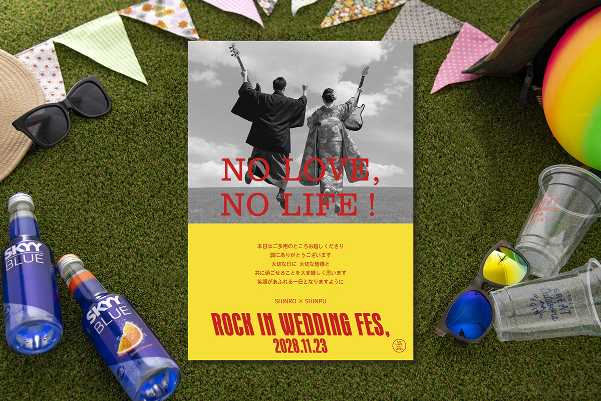 当社でチケット風招待状、フェス風席次表などをご注文された方は、ご自身のチケットなどで使用したロゴなどを配置し、結婚式のタイトル×新郎新婦さまのお名前にしてみてはいかがでしょうか。